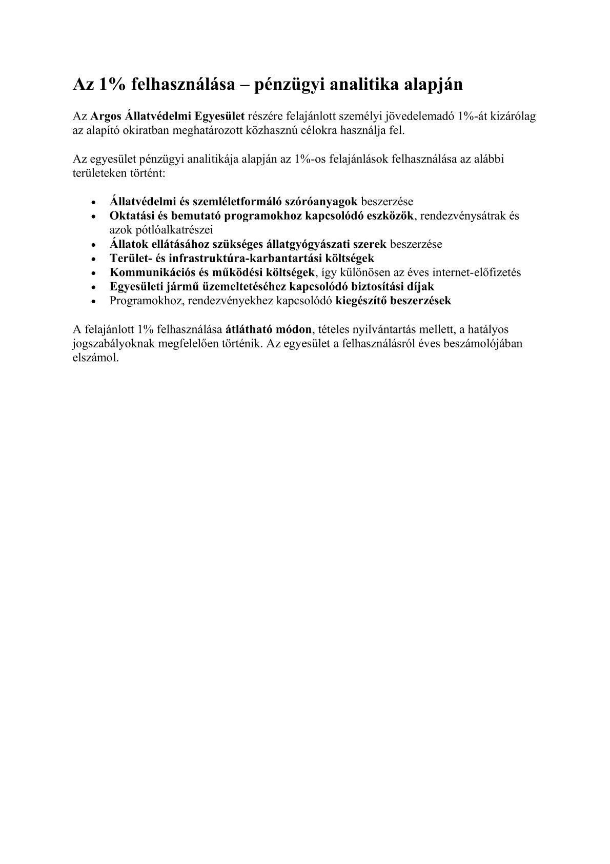 A közzétett dokumentumok célja, hogy minden érdeklődő számára ellenőrizhető legyen, miként gazdálkodunk a rendelkezésünkre bocsátott forrásokkal, és hogyan használjuk fel azokat állatvédelmi, szemléletformáló és közösségi céljaink megvalósítása érdekében.